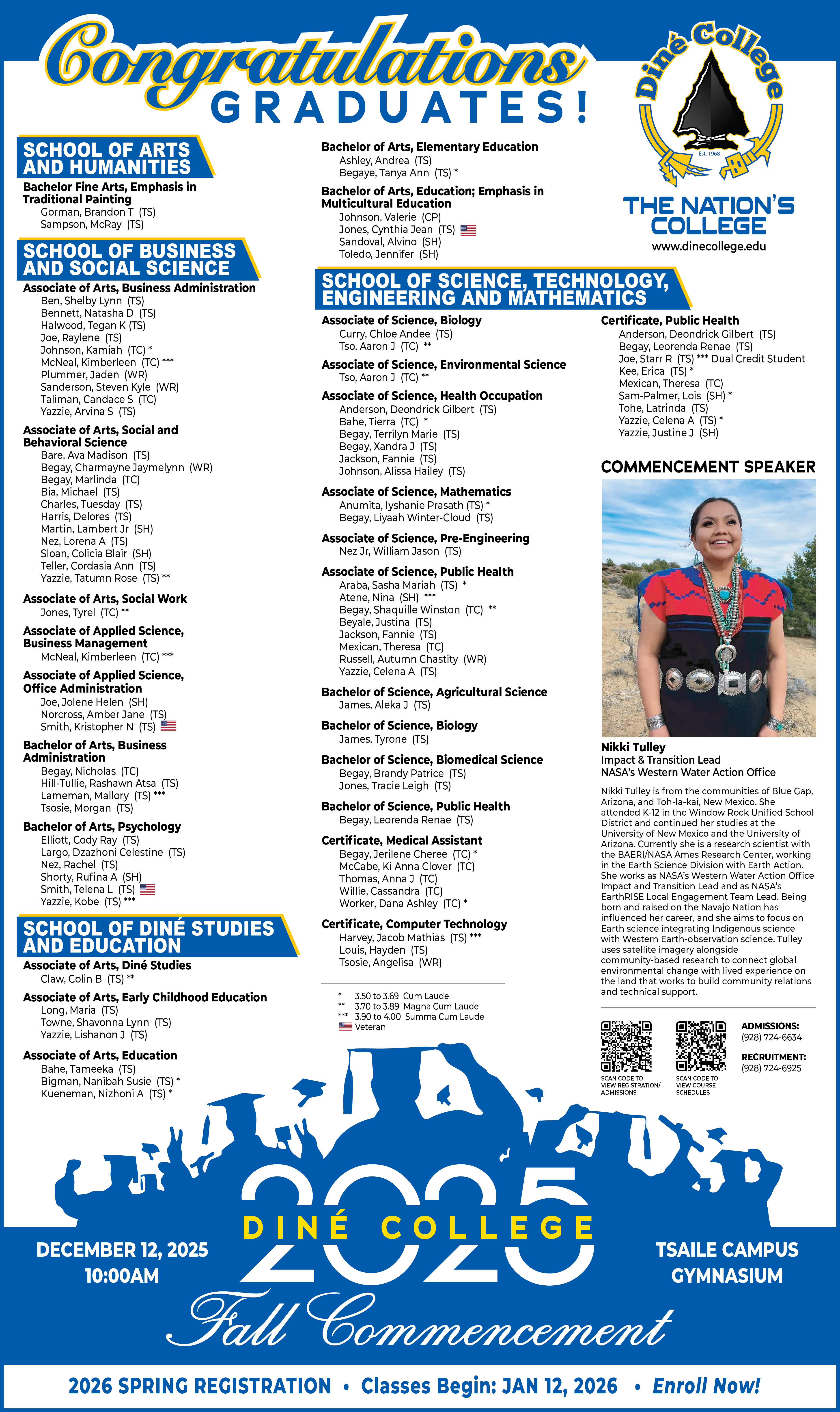 Diné College will celebrate its Fall 2025 graduates on Friday, December 12, 2025, from 10:00 a.m. to 12:00 p.m. at the Tsaile Campus, northeast of the gymnasium. The ceremony will feature keynote speaker Nikki Tulley, a research scientist with the BAERI/NASA Ames Research Center.