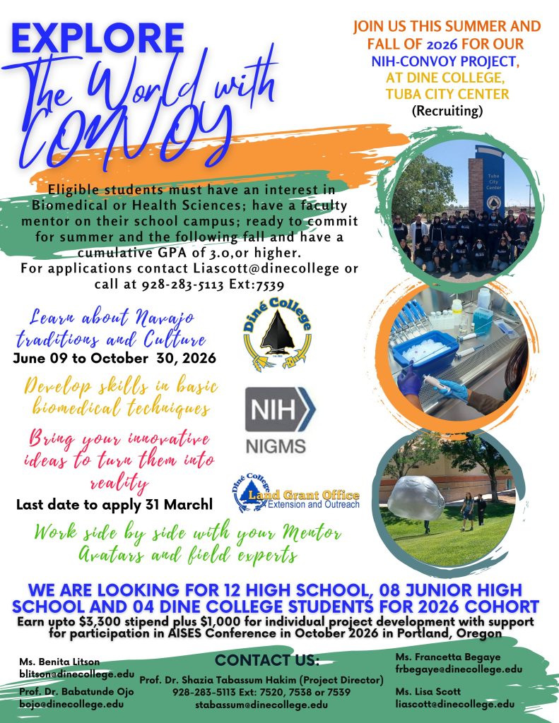 3) Prepare students to enroll in institutions of higher learning and provide opportunities to earn college credit in high school through Diné College’s Dual Enrollment Program for biomedical sciences, and 4) Develop curriculum for a 10-week summer program to support activities by “CONVOY”.
